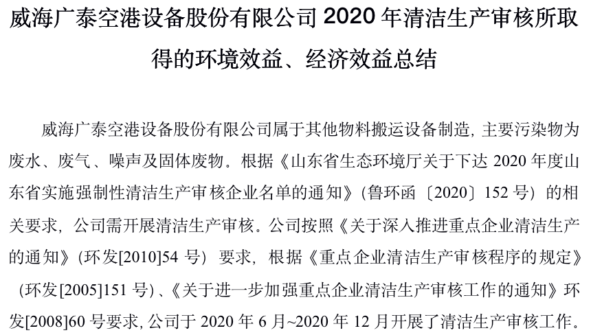 威海廣泰空港設備股份有限公司2020年清潔生產審核所取得的環境效益、經濟效益總結威海廣泰空港設備股份有限公司屬于其他物料搬運設備制造,主要污染物為廢水、廢氣、噪聲及固體廢物。根據《山東省生態環境廳關于下達2020年度山東省實施強制性清潔生產審核企業名單的通知》(魯環函〔…